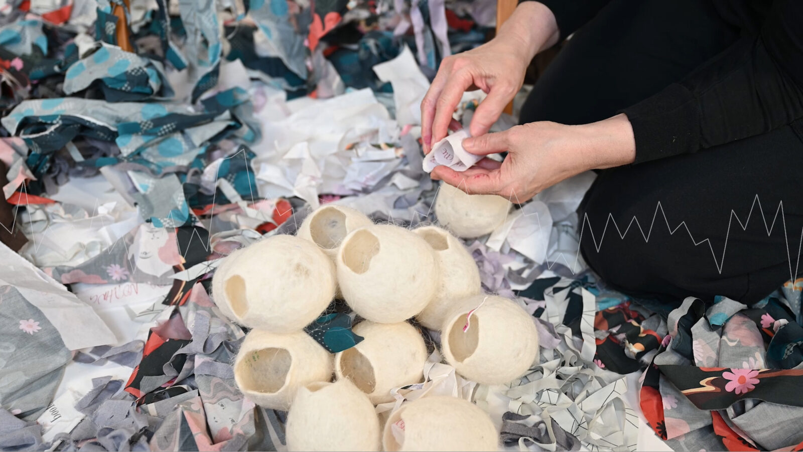 Eleven Words is an installation combining video, sculpture, and layered textile works. Originating during a residency in Iceland, it explores the tension between environmental overwhelm and the act of making—how we search for meaning, connection, and care. Through repetition and the reworking of a single phrase, the work moves from doubt toward a quieter, more deliberate sense of hope.