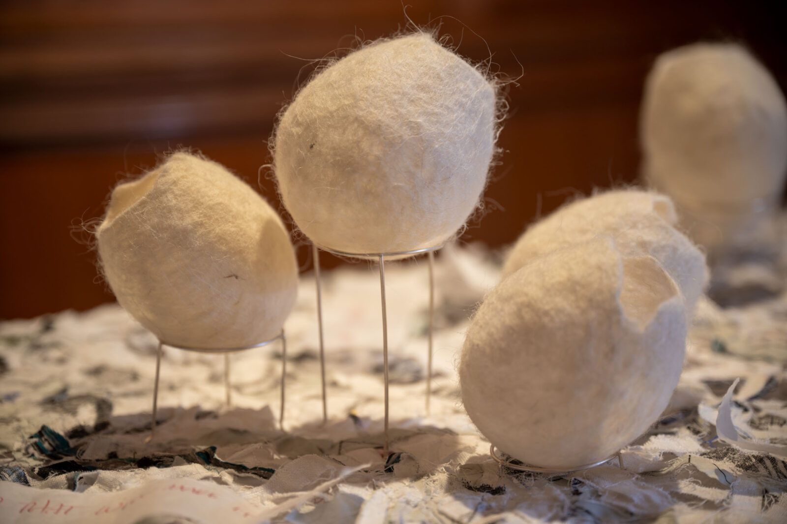 felted Icelandic wool, sterling silver, fabric scrap, thread, paper, acrylic, video