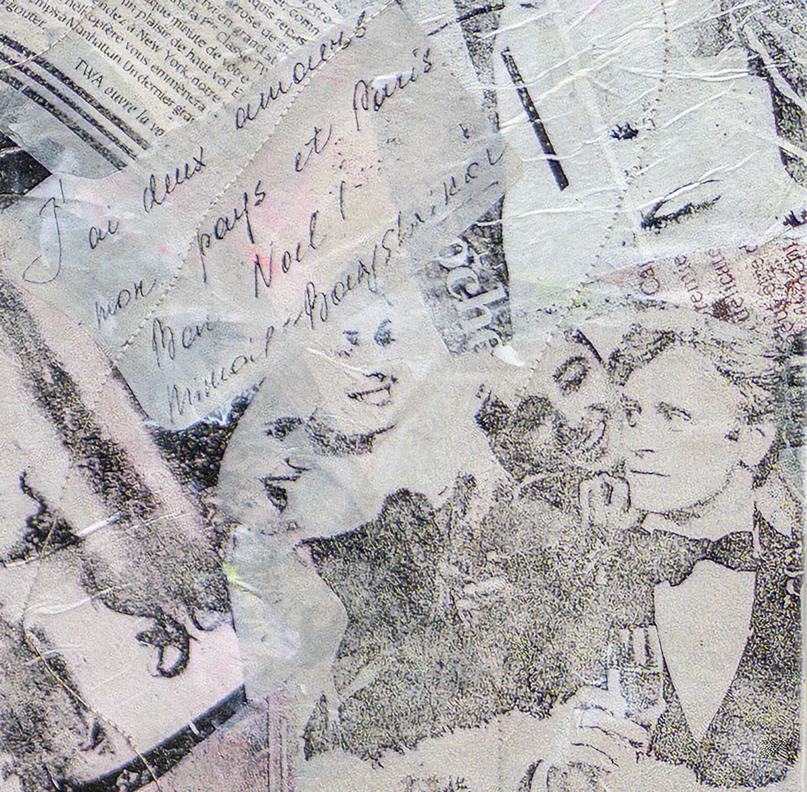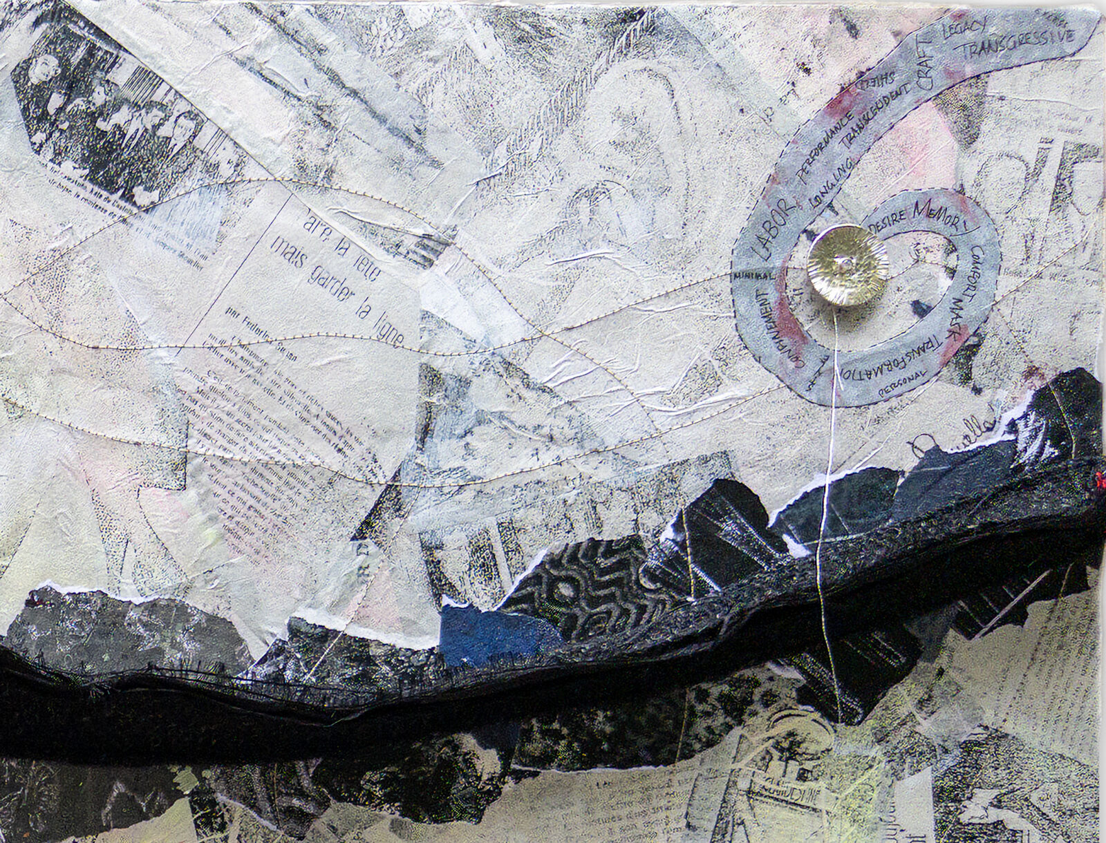 acrylic monoprints on paper and tissue (image transfers from D’86/J’87 edition of Vogue Paris), chalk pastel, foil, pen, Harris Tweed, silk dupioni, thread, hand-fabricated sterling silver and cubic zirconia button, vintage crystal button, mounted on cradled board